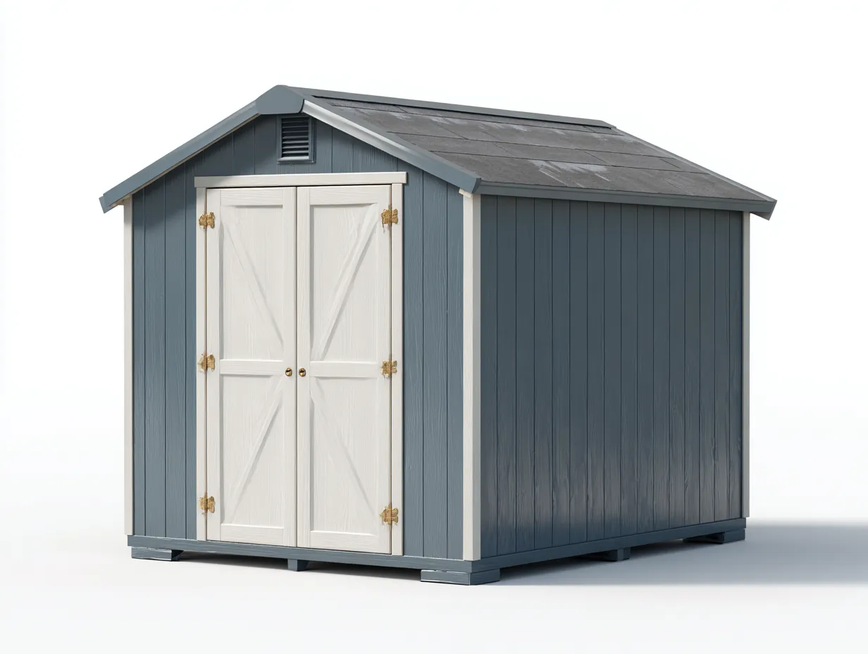 La estructura está fabricada en madera con acabado en color azul combinado con detalles en blanco que aportan una apariencia equilibrada y decorativa. El techo inclinado ayuda a facilitar el drenaje del agua y contribuye a proteger el interior. Las puertas dobles están equipadas con bisagras metálicas que proporcionan un uso estable y funcional.