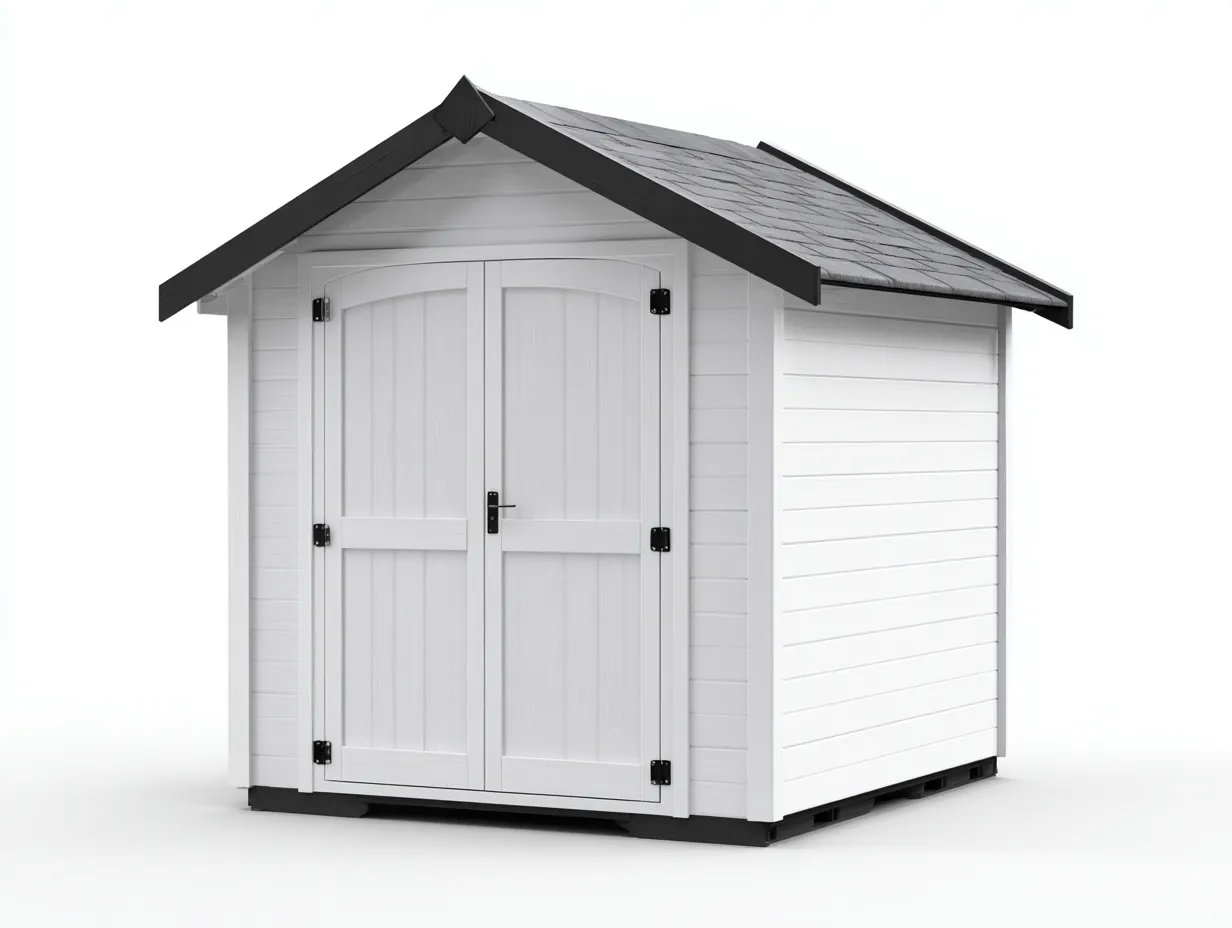 La estructura está fabricada con paneles de madera resistentes con acabado en color blanco que aporta una apariencia limpia y luminosa. El tejado inclinado con acabado en color negro ayuda a proteger el interior frente a las condiciones climáticas habituales. Las puertas dobles permiten un acceso cómodo al interior para almacenar o retirar objetos.