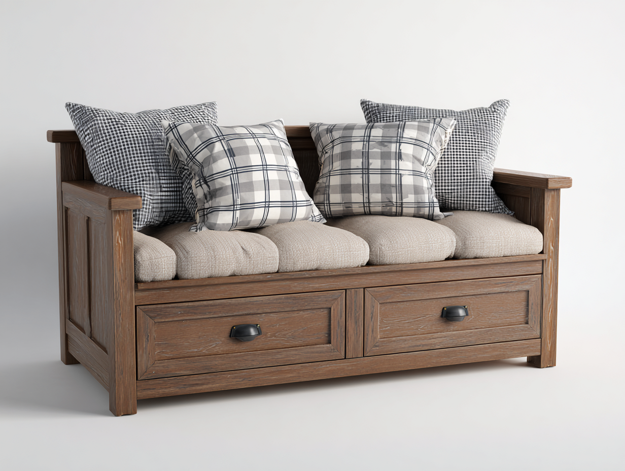 El diseño permite aprovechar mejor el espacio en interiores al combinar asiento y cama en un mismo mueble. Los cajones inferiores facilitan el almacenamiento de ropa de cama u objetos cotidianos manteniendo el espacio organizado. Los reposabrazos rectos aportan apoyo adicional y contribuyen a una estructura firme.