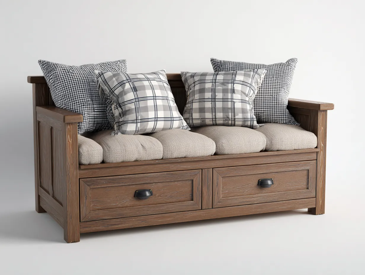 La estructura está fabricada en madera maciza con acabado en color marrón que proporciona estabilidad y resistencia para el uso diario. El asiento incorpora cojín acolchado que mejora la comodidad durante el descanso. En la parte inferior se integran cajones que ofrecen espacio adicional para guardar textiles u otros objetos del hogar.