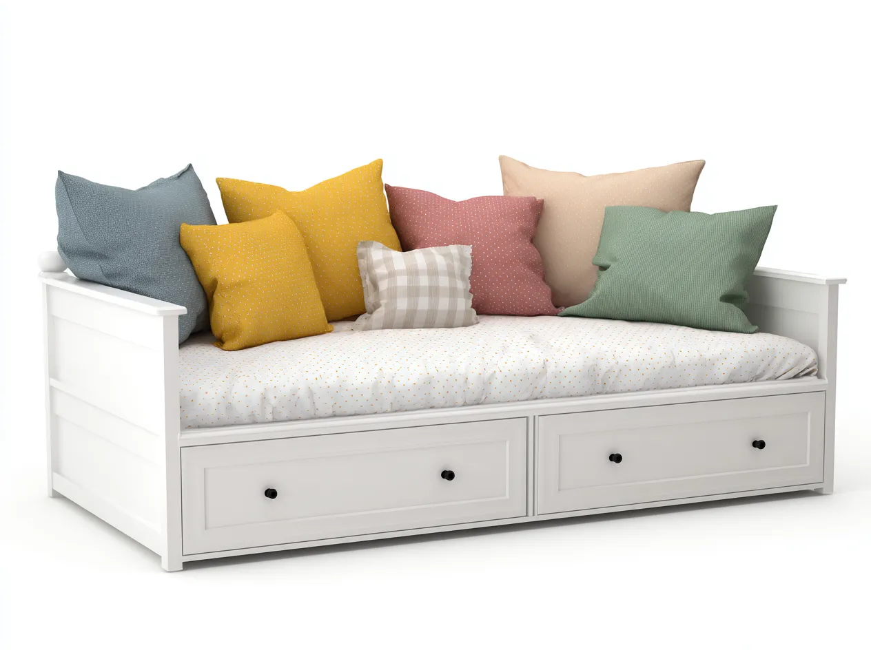 El sofá cama combina comodidad y funcionalidad en un solo mueble. Los laterales elevados ofrecen apoyo al sentarse y ayudan a mantener una postura relajada. Los cajones inferiores permiten organizar textiles o accesorios del hogar mientras se mantiene el espacio ordenado.